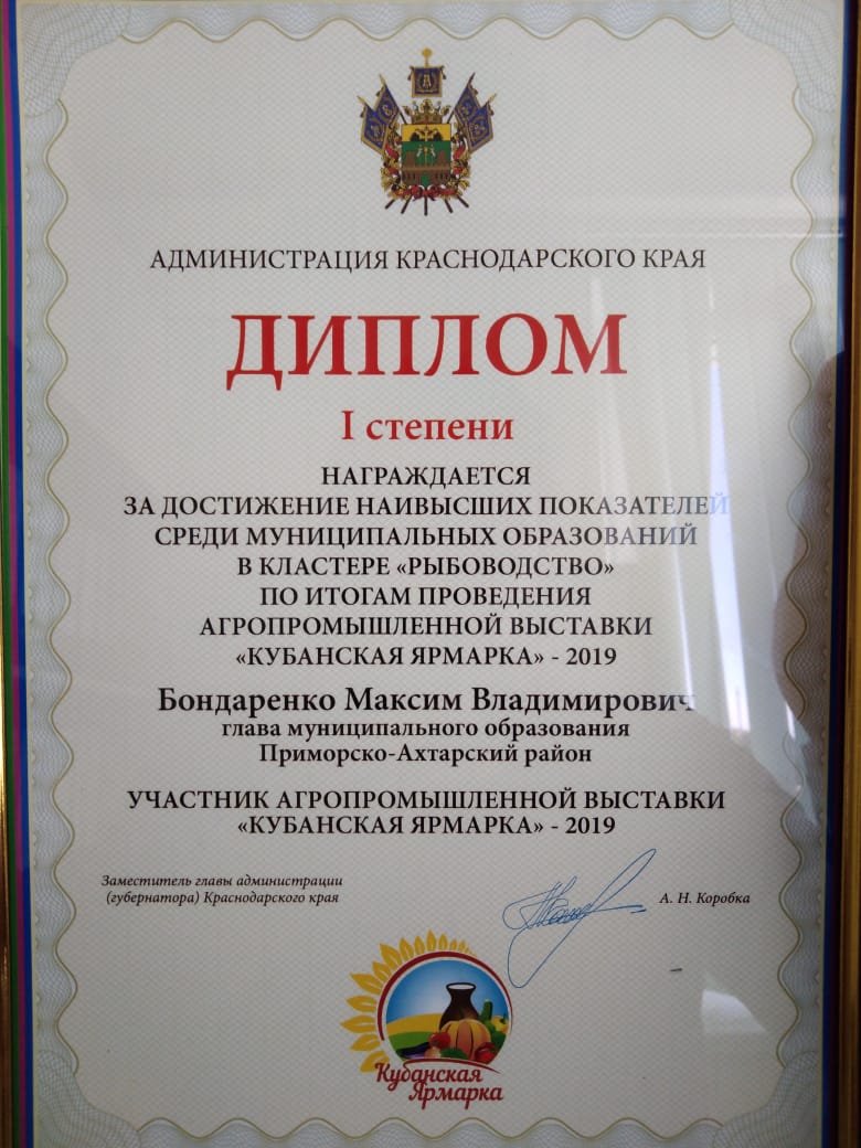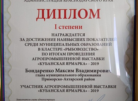 Так же наш район был награжден дипломом администрации Краснодарского края I степени за достижения наивысших показателей среди муниципальных образований в кластере «Рыбоводство» по итогам проведения агропромышленной выставки «Кубанская ярмарка 2019».